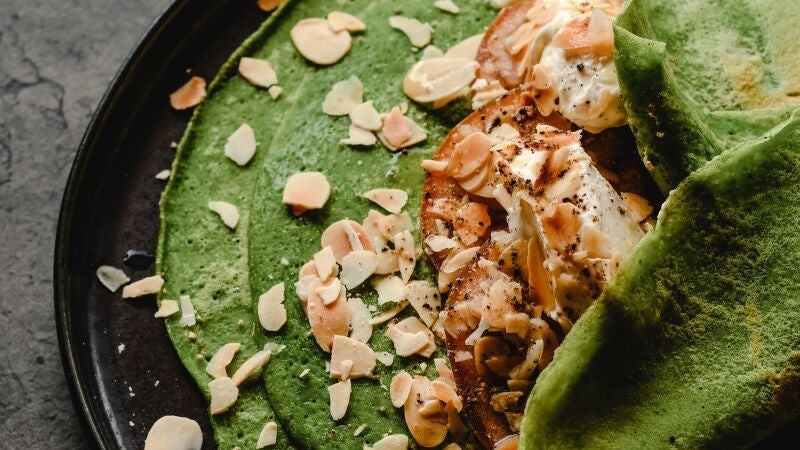 Aunque la masa contiene espinacas, puedes personalizar tu crepe con salmón de la forma que prefieras. Puedes agregar una nueva textura embadurnando la superficie con un poco de queso crema o añadir otro toque vegetal con trozos de aguacate o espárragos verdes a la plancha. También puedes darle un sabor más marinero con unos langostinos cocidos.