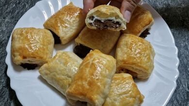 2. Cortamos un rectángulo y cubrimos las onzas con la mitad del hojaldre.