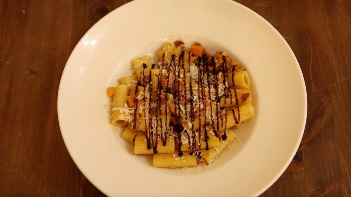 ¿Qué nos decís de este plato de rigatonis con butifarra y verduras?