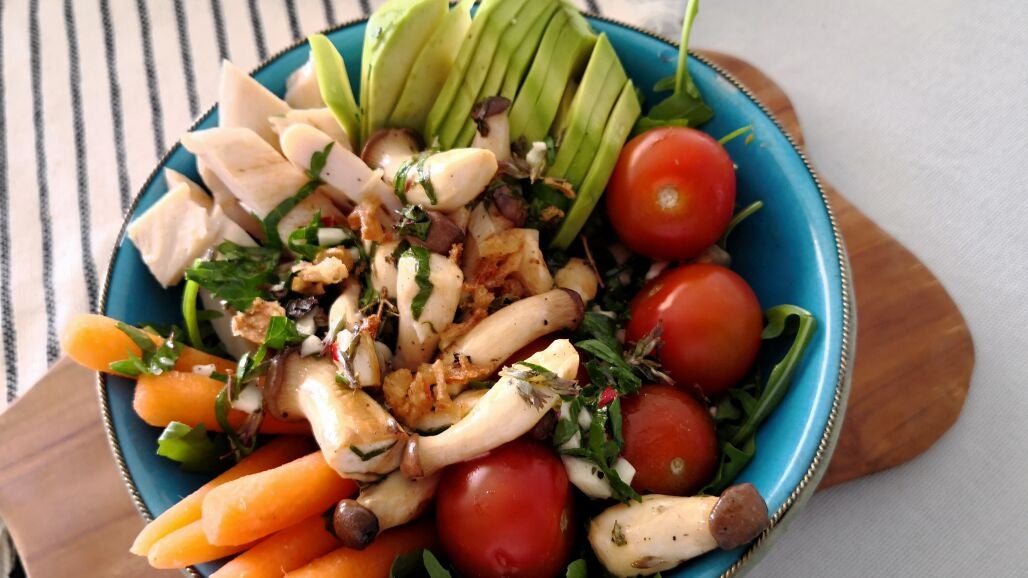 Esta semana Bárbara ha preparado una deliciosa ensalada con aguacate, pollo, tomatitos cherry, mini zanahorias y le ha dado el toque final con un salteado de setas y chimichurri.