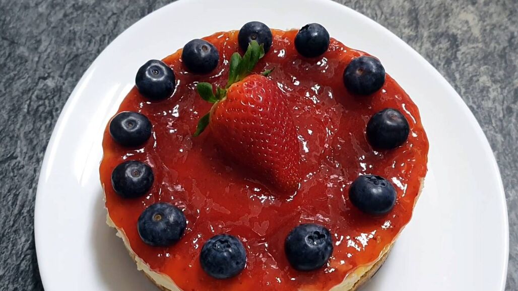 El último paso es decorarla con mermelada de fresa y arándanos u otra fruta a nuestro gusto.