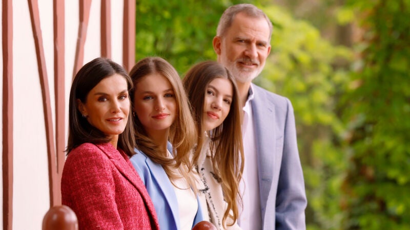 En los retratos, captadas por los fotógrafos oficiales del Palacio de la Zarzuela hace unas semanas, los cuatro han posado de la manera más relajada e informal y sin ocultar sus sonrisas y gestos de cariño. En uno, aparece el Rey con sus manos en los hombros de la reina Letizia, sentada en la parte superior del respaldo de un banco, con la Princesa y la Infanta de fondo.