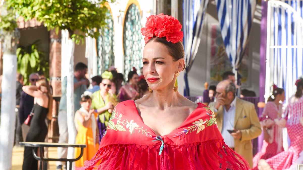 Eva González, feliz y espectacular con un traje de flamenca rojo en la Feria de Mairena del Alcor