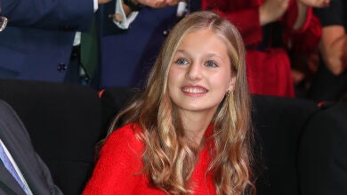 Recurriendo de nuevo al pelo suelto y con ondas, la princesa ha optado por un vestido rojo de tejido tipo tweed y ha hecho gala una vez más de sus inseparables bailarinas. Sin embargo, un detalle ha sido determinante a la hora de demostrar que va camino a la adolescencia, y es que la heredera al trono... ¡ha lucido su primer maquillaje! Leonor llevaba un suave gloss rosado en los labios y también rimmel, con el que ha resaltado el bonito color de sus ojos.
