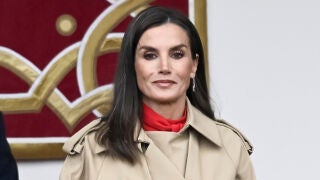 La reina Letizia ha lucido un vestido rojo muy elegante y una gabardina de color beige estilo batín. Con el pelo suelto, doña Letizia ha optado por unos pendientes colgantes de diamantes y rubíes.