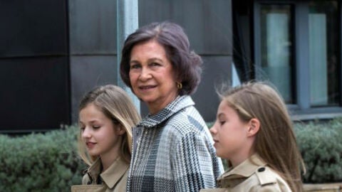 La reina Sofía de la mano de la princesa Leonor y la infanta Sofía junto a sus padres para ver a don Juan Carlos