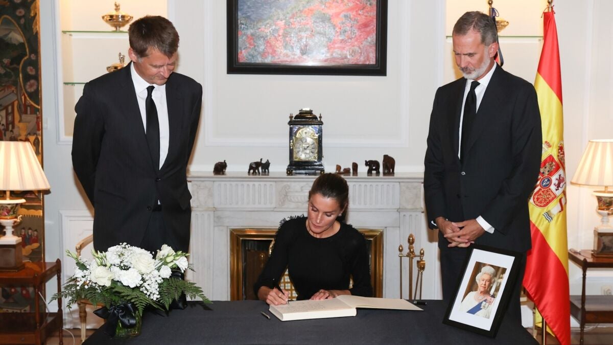 El rey Felipe VI y la reina Letizia han visitado durante la tarde del viernes la residencia del embajador del Reino Unido en España, Hugh Elliott, para expresarle su pésame por la muerte de la reina Isabel II y firmar en el libro de condolencias.