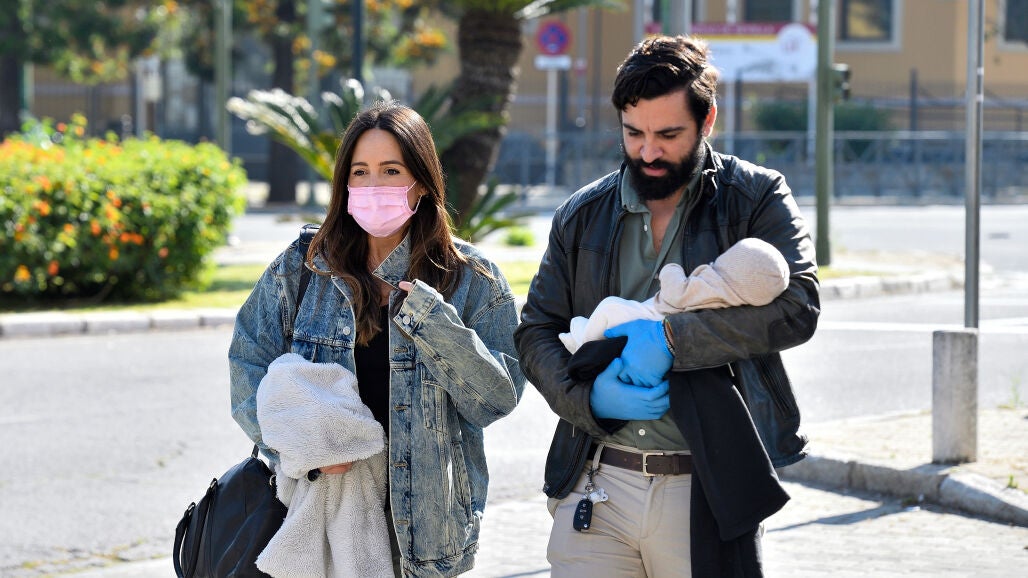 En las imágenes podemos ver a los padres cómo han posado ante los fotógrafos con sus correspondientes mascarillas puestas y Jacobo con guantes puesto que era él el que llevaba al bebé en bazos.
