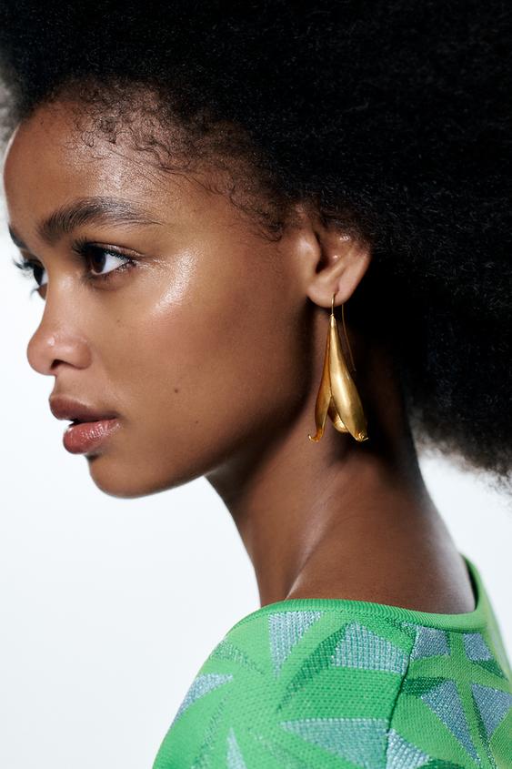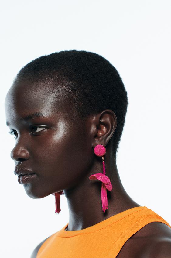 Un accesorio imprescindible son los pendientes. Zara te invita a combinar el conjunto con unos pendientes de flores y abalorios en color beige. Casualmente, estos pendientes también están disponibles en color fucsia, por si quieres aportar color.