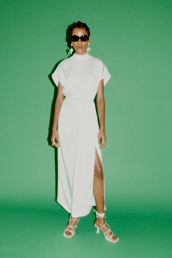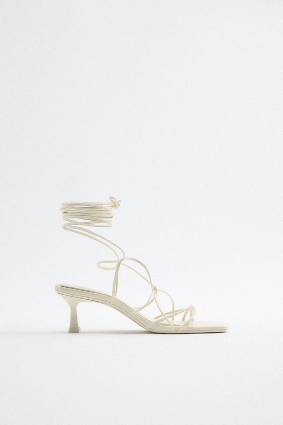 Como toque final, el zapato también es un complemento esencial. Dando un toque más desenfadado y jovial, Zara te propone combinar su conjunto con estas sandalias de color blanco crudo con tiras y tacón de 5 centímetros, perfecto para elevar un poco tu figura y aguantar durante todo tu día especial sin ninguna molestia.