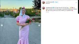 Por su parte, la creadora de contenido Marta Camin se atrevió con su primer vestido de chulapa, una propuesta más cercana al corte tradicional, ya que se trata de un sola pieza. Sin embargo, lo rompedor estuvo en el tejido: en lugar de los típicos lunares o estampados florales, su vestido era blanco con flores bordadas. Un diseño sencillo, que acompañó con un mantón color tierra, pero que destacaba por la originalidad de los materiales utilizados.