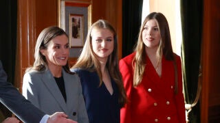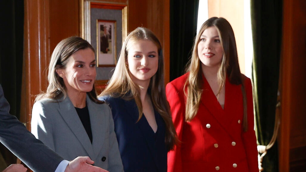 Letizia, Leonor y Sofía han destado con sus looks coordinados en las audiencias previas a los Premios Princesa de Asturias 2025. Trajes de Mango, Boss y Tommy Hilfiger en color gris, azul y rojo.