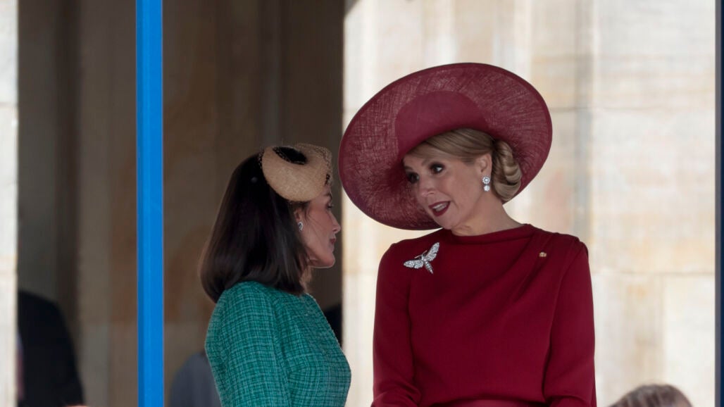 El llamativo y original tocado de la reina Letizia y el total look burdeos de Máxima de Holanda en su primer acto juntas