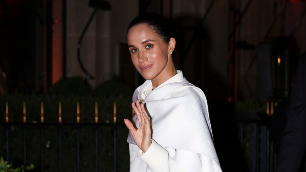 Para la ocasión, Meghan Markle escogió un conjunto blanco impoluto de tres piezas: una camisa fluida de seda, unos pantalones anchos de caída elegante y una capa estructurada —pieza estrella de la temporada— que aportaba volumen en los hombros. Apostó por un estilismo minimalista y sofisticado, con el pelo recogido en un moño bajo tipo clean look y un maquillaje natural que destacaba por la luminosidad de su piel, que lucía de lo más saludable y jugosa.