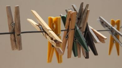 1. Quitamos cada una de las piezas metálicas con forma de muelle que tienen las pinzas de la ropa, de manera que nos queden solamente dos trozos de madera.