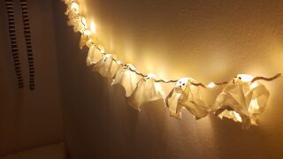 El objetivo es hacer unos pequeños fantasmas de papel y, cuando estén secos, ir colocándolos en cada una de las luces de la guirnalda.