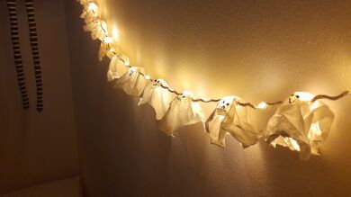 10. Con una aguja, haz agujeros en los lados de cada fantasma y pasa la cinta de la guirnalda en medio, hasta colocar cada fantasma encima de una de las luces.