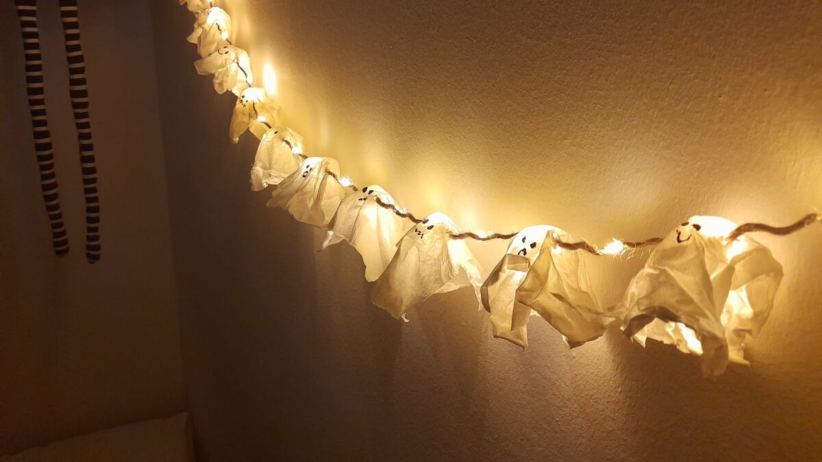 Para hacer una guirnalda luminosa necesitas muy poco material y un poco de tiempo. Para lograr hacerla bien vas a necesitar un par de días, puesto que los fantasmas necesitan unas horas de secado imprescindibles. Por lo tanto, ponte a ello una tarde o una mañana sabiendo que hasta el día siguiente no la podrás terminar.