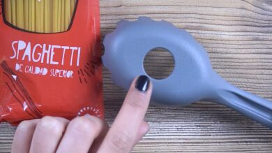 Por ello, de ahora en adelante para preparar un plato de espaguetis sin pasarnos de medida sólo necesitaremos usar el agujero de esta cuchara para medir la cantidad exacta que necesitamos por persona.