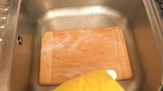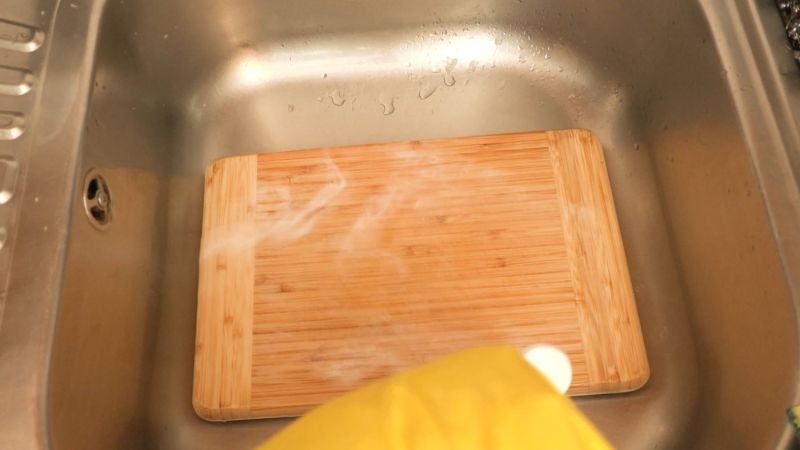 A continuación, vuelve a enjuagar la tabla de cortar con abundante agua caliente para retirar el agua oxigenada y finalmente frota la tabla con agua y jabón. La herramienta, además de desinfectada, ya no tendrá esas manchas que parecían difíciles de eliminar.