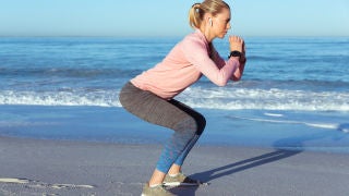 Ejecuta una sentadilla con los brazos flexionados y con una mancuerna en cada mano. Si no tienes en casa, te servirán dos botellas de agua o dos cartones de leche. En cada subida, extiende los brazos y vuelve abajo de modo que los puños nunca bajen de la altura de los hombros. Realiza 3 series de 20 repeticiones con 15 segundos de recuperación entre ellas.