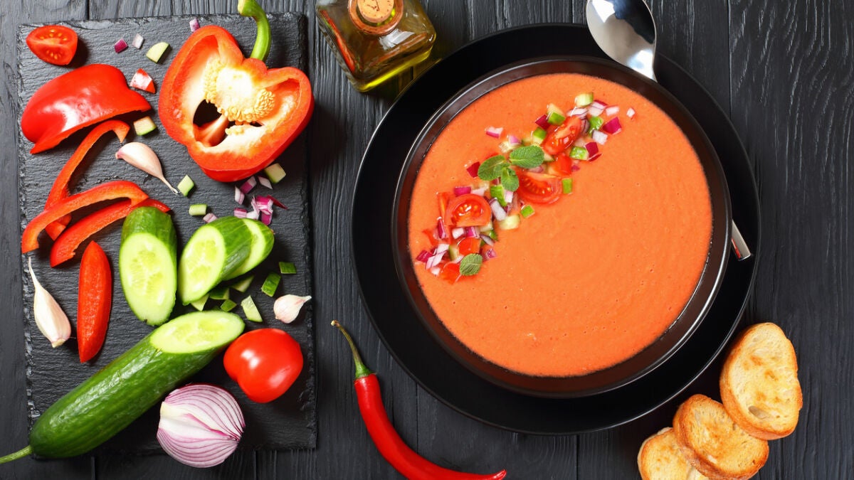La más conocida es nuestro típico gazpacho. Para que conforme un plato único, te recomiendo sumar a tus ingredientes (tomates, pepino, pimiento y ajo) más hortalizas picadas, un huevo cocido y taquitos de jamón. Corona con un chorreoncito de aceite de oliva virgen extra.