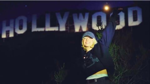 En la pieza publicada, se puede ver a la actriz junto a un equipo de producción trepar la colina de Hollywood. Una vez llegan al emblemático cartel de Los Ángeles, sacan de sus bolsas una cantidad ingente de sujetadores atados entre sí.