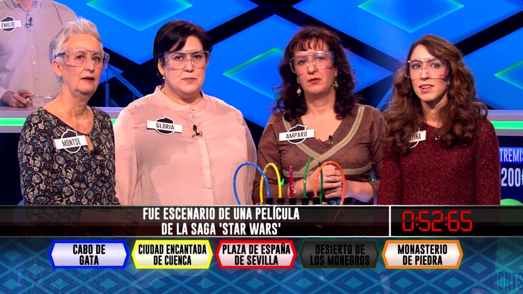 A las actuales campeonas del programa, las ‘Extremis’, con 210.000 € acumulados, es difícil cogerlas desprevenidas porque dominan todo tipo de temas. Otro ejemplo más ha sido esta tarde con ‘La Guerra de las Galaxias’, así que no han tenido problemas para resolver que en Sevilla se rodaron escenas del Episodio II, ‘El Ataque de los Clones’. ¡La fuerza las acompaña!