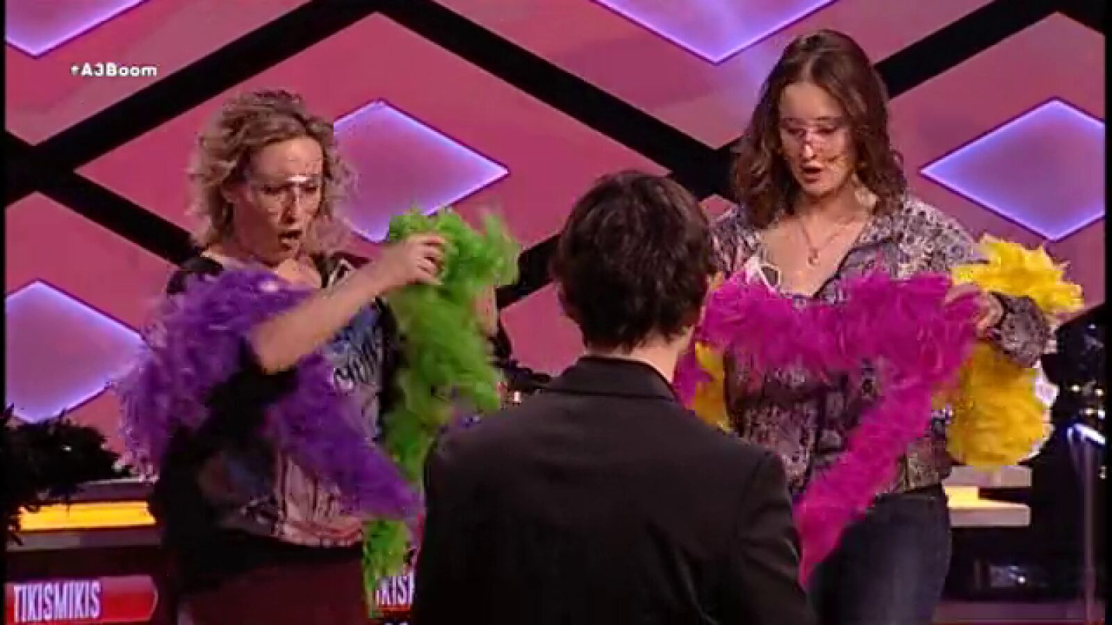 Juanra, ¡se te ve el plumero! Cuatro leonesas, componentes del equipo ‘Tikismiskis’, se han presentado en el programa luciendo unas boas de plumas muy cabareteras y han decidido ponerle color al uniforme negro de Juanra forrándolo directamente con cientos de plumas multicolores. ¡Qué pinta! ¡Qué arte! Las ‘Tikismiskis’, además, se han atrevido a cantar un villancico con el público, un gesto muy apropiado para estas fechas tan señaladas.