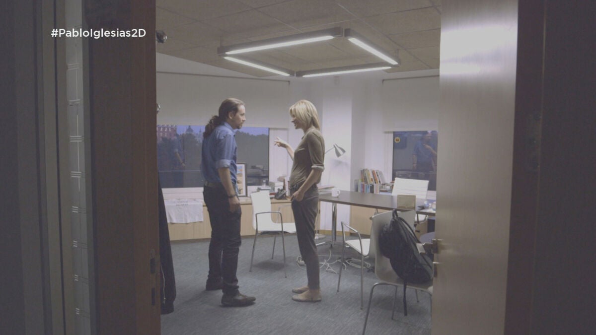 Pablo Iglesias le muestra a Susanna Griso la sede de Podemos en Madrid. La presentadora se muestra sorprendida por los objetos que encuentra en el despacho del político.