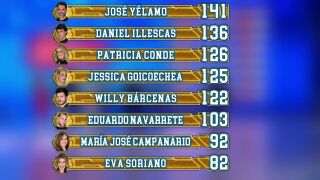 Liderando la clasificación está Yélamo, seguido muy de cerca por Daniel Illescas y Patricia Conde. A tan solo un punto se sitúa Jessica Goicoechea y muy cerca Willy Bárcenas.