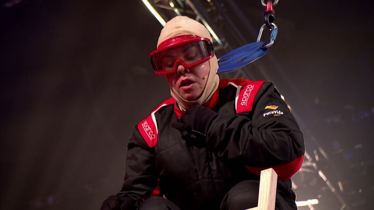 La concursante se ha agobiado durante los ensayos, lo primero que tiene que hacer en enfrentarse a su miedo a las alturas y luego pasar la barrera del fuego.