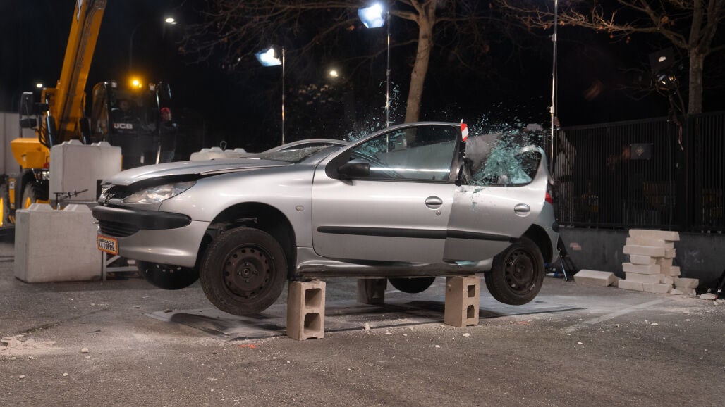 ¿El objetivo? Cortar un coche por la mitad. Pero antes, el experimento será puesto a prueba cortando un muro de hormigón de 500 kilos.