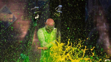 En ese movimiento, la energía potencial se transformó en energía cinética, alcanzando su punto máximo justo en el centro del recorrido. Allí apareció Keller, “Globo-Man”, que rajó los globos en el instante preciso antes de que se produjera la colisión. El resultado fue un estallido súbito de color, con la pintura dispersándose hacia afuera y liberando toda la energía acumulada. ¡Imperdible!