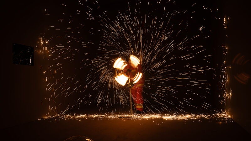 El resultado es un efecto visual muy llamativo que nos permite ver de forma clara el principio de conservación del momento angular, además de cómo la fuerza centrífuga y la simetría del sistema guían el movimiento de las partículas en combustión.