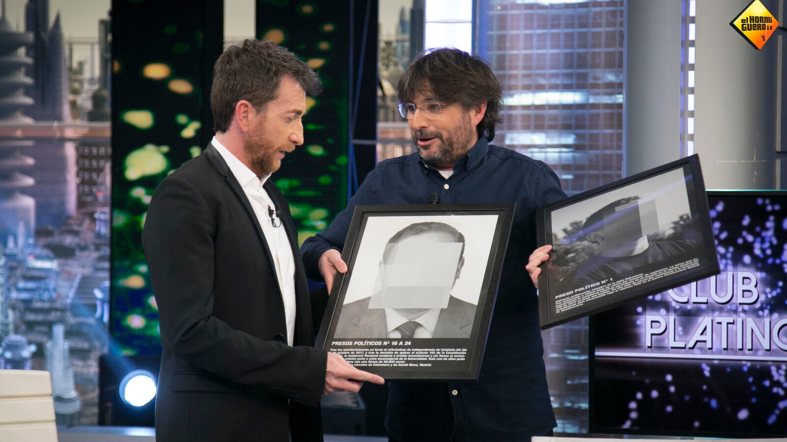 Ha llegado la decimotercera vez que Jordi Évole visita 'El Hormiguero 3.0' y, Pablo Motos ha querido otorgar al invitado los privilegios de pertenecer al prestigioso 'Club Platino'. El invitado, que ha podido observar su momentazos durante sus visitas, ha querido dedicar un regalo muy especial a Pablo Motos, dos cuadros de la obra 'Presos Políticos' que han retirado de ARCO; y unas bonitas palabras hacia el programa: "Me siento en casa".