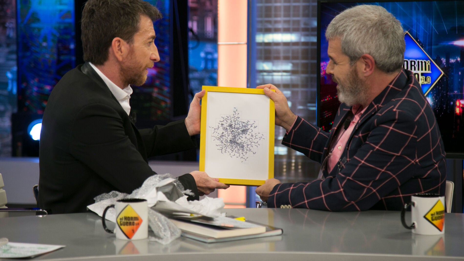 La entrevista entre Lorenzo Caprile y Pablo Motos ha sido de lo más agradable y Caprile le ha traído un regalo a Pablo. Nada más abrirlo ha pedido que le explique qué es y el modista ha aclarado que es la reproducción de una obra de uno de sus mejores amigos que acaba de inaugurar una "exposición maravillosa".