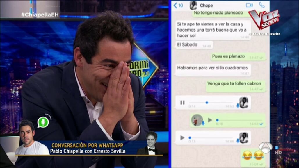 Ernesto Sevilla colgó en su cuenta de Instagram unos audios en los que Pablo Chiapella le pedía ayuda para un monólogo, unas conversaciones que demuestran el buen 'rollo' y la absoluta confianza que hay entre los dos actores. Chiapella se ha llevado las manos a la cabeza cuando Pablo Motos le ha puesto esos audios de WhatsApp. ¡Dale al play para ver este momentazo!