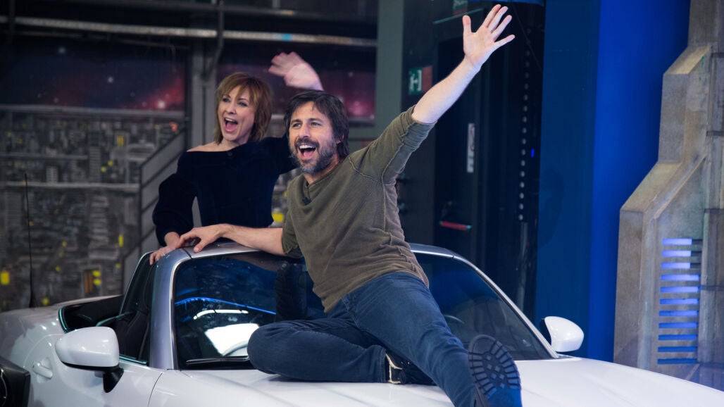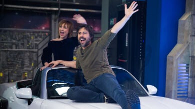 Pablo Motos entrega a Hugo Silva la tarjeta que le acredita como invitado Platino de 'El Hormiguero 3.0'