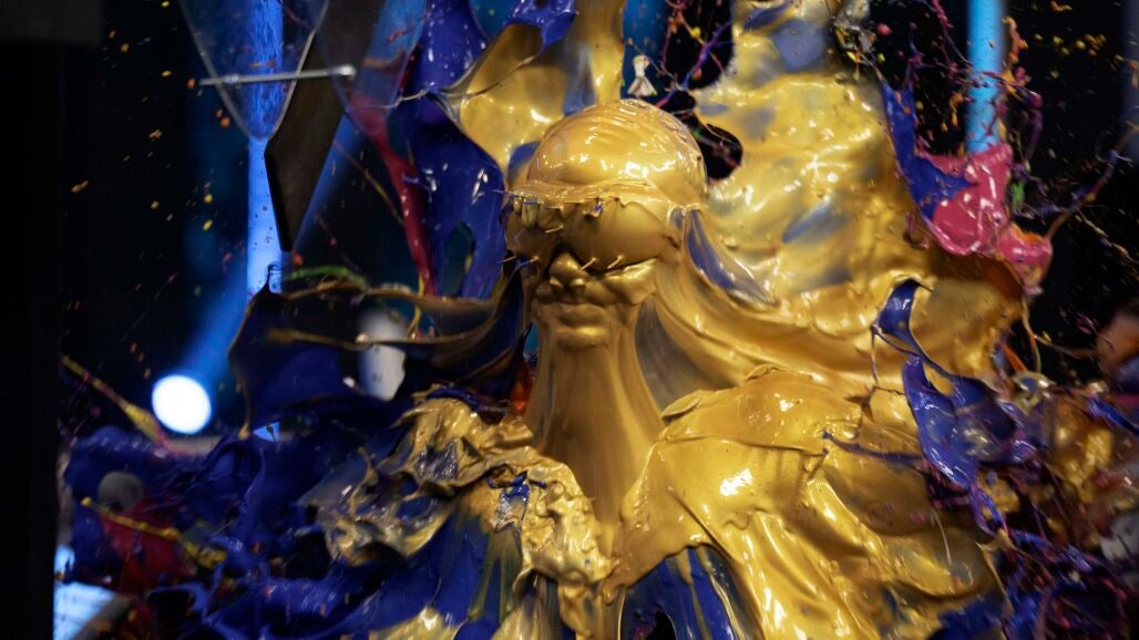 Para lograrlo, el equipo preparó diez globos llenos de pintura de colores, colocados en un péndulo estratégicamente para que explotaran al mismo tiempo. El encargado de recibir el impacto fue Keller, uno de los miembros del equipo de ciencia del programa.