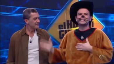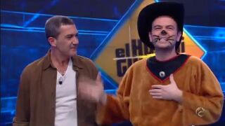 Jandro se disfraza del gato con botas para enseñar su magia a Antonio Banderas y Salma Hayek en El Hormiguero. Tenemos que conseguir que Jandro clave la espada en la carta de Salma, ¿Conseguiremos la magia en El Hormiguero?