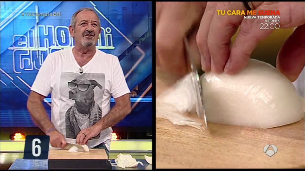 Pablo Motos ha asegurado que Karlos Arguiñano es el cocinero que corta la cebolla más fina. Nos ha hecho una pequeña demostración de su destreza con el cuchillo cortando una cebolla sin mirar.