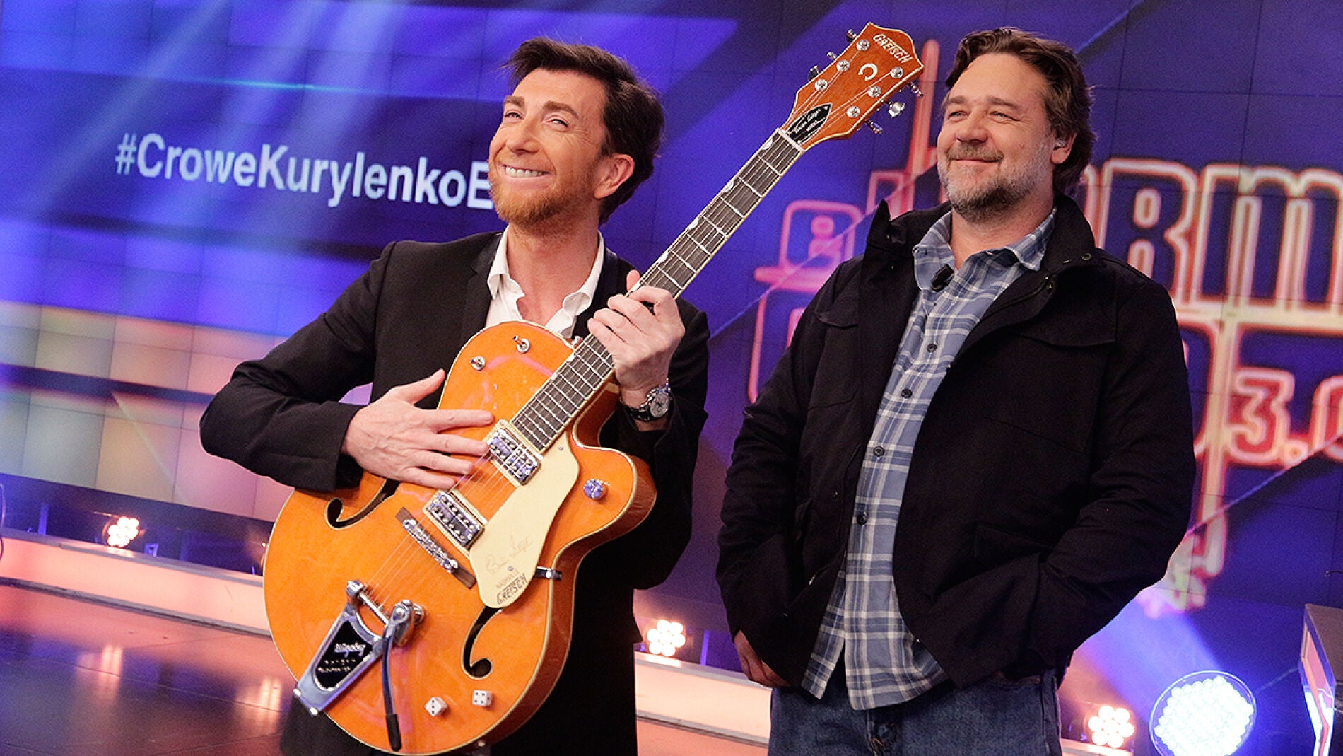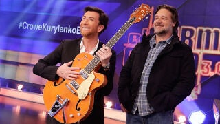 El actor Russell Crowe ha sorprendido al presentador Pablo Motos al entrar al plató con una guitarra. El actor ha recordado que la última vez que visitó El Hormiguero 3.0 Pablo Motos le regaló una guitarra y en esta ocasión ha sido Crowe quien ha querido devolverle el regalo.