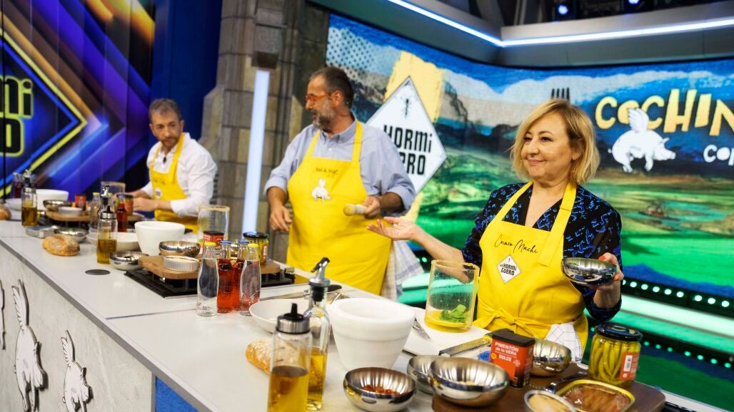 En esta ocasión, David de Jorge ha querido enseñar a preparar a Pablo Motos y a Carmen Machi una bebida en honor a la actriz invitada, el 'Machi-Tonic', con ingredientes como hierbabuena, naranja, azúcar, pero sin alcohol.