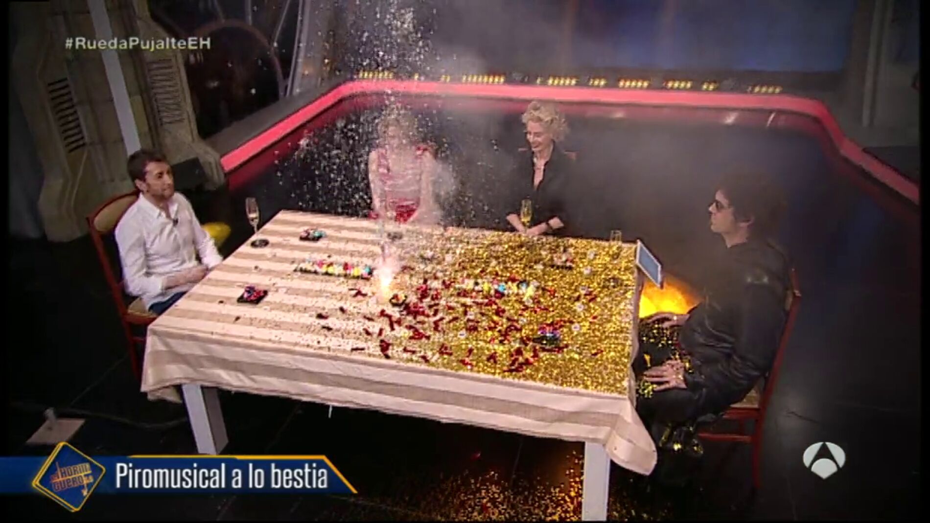El Hombre de Negro ha querido impresionar a nuestras dos invitadas y celebrar que van a estrenar una nueva película española con un musical muy pirotécnico, lleno de luces y fuegos artificiales.
