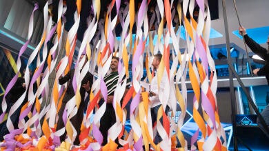 La forma y la resistencia aerodinámica de los rollos de papel han formado una lenta caída, creando lo semejante a una lluvia que cubría por completo tanto a Luis Fonsi como a Pablo Motos, pese a la broma que le ha hecho Marron al presentador sobre su estatura.