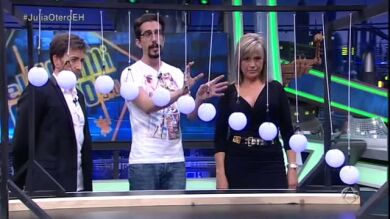 Marron ha enseñado a Julia Otero un especial ciencia con luces en El Hormiguero. Con unos péndulos colocados en posiciones distintas, Marron mueve la mesa y nos enseña los movimientos graciosos que hacen en el aire.Pablo Motos no se puede explicar el movimiento tan perfecto que consiguen los péndulos con la oscilación. El segundo experimento ha consistido en cuadrar las revoluciones de la sierra con un efecto de luz.