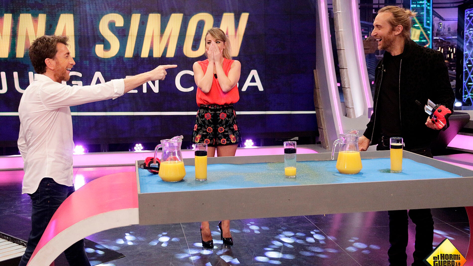 Anna Simón le ha propuesto a David Guetta jugar al juego del 'vaso de zumo', que consistía en llenar un vaso con este líquido, pero con la dificultad de llevar unas gafas que distorsionan la realidad. Si David perdía, el mayordomi de Anna Simón tendrá que someterse al Condom Challenge.