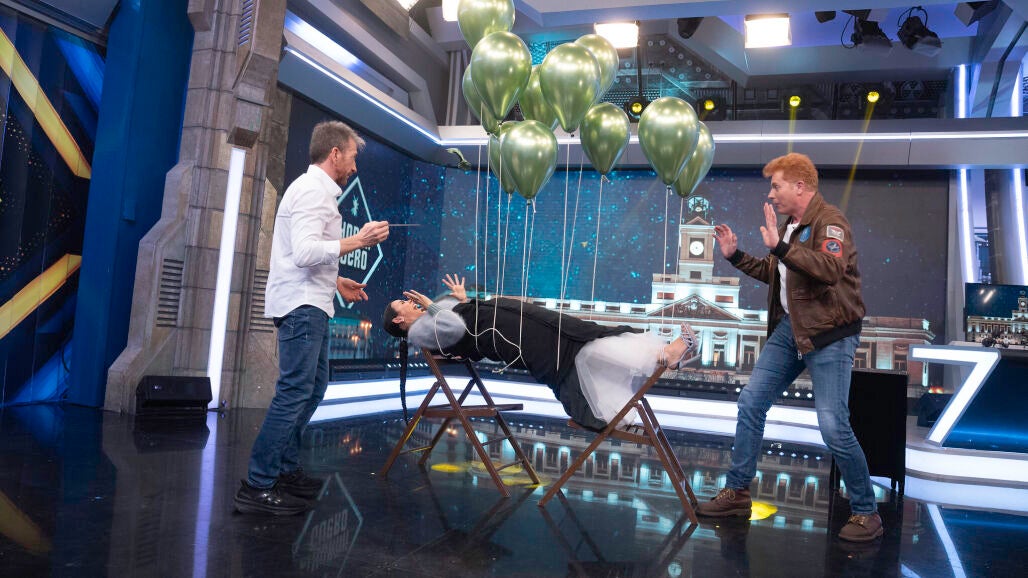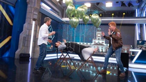 Cristina se ha tumbado sobre una tabla dispuesta entre las dos sillas. La sorpresa ha sido cuando Yunke ha quitado dicha tabla y la invitada se ha quedado flotando. ¿Era gracias a los globos? El mago y Pablo los han ido explotando uno a uno: ¡Cristina se ha mantenido volando!