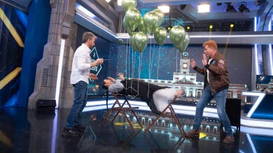 Ha sido una noche llena de emociones. De hecho, la invitada ha acabado volando, literalmente, gracias al mago Yunke. El ilusionista ha aparecido en el plató con dos sillas y doce globos, simbolizando las doce uvas de las Campanadas.